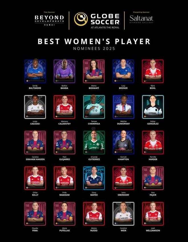 北京时间11月19日,全球足球奖公布了2025年最佳女足球运动员入围名单,博马蒂、普蒂亚斯和凯利入围。 2025 年全球足球奖入围最佳女子足球运动员 巴塞罗那女子足球队:Aitana Bommatti、Caroline Hansen、Patri Guhiharo、Payol、Claudia Pina、Alexia Ptelias 阿森纳女子足球队:Mariona Caldente、Chloe Kelly、Ma Anum、Alessia Lasso、Lee Williamson 拜仁女子足球队:Clara Biel、Pernille Ha、German Oberdorf 切尔西女队足球队:巴尔的摩,铜牌,汉娜·汉普顿 皇家马德里女子足球队:琳达·凯塞多,贝利恩 女子足球队:迪莫奈 奥兰多光荣女子足球队:芭芭拉·班达·帕尔梅拉斯 女子足球队:阿曼达·古铁雷斯 巴黎足球俱乐部女子足球队:克拉拉·马特奥 新泽西州哥谭女子足球队:埃西·冈萨雷斯女子足球队堪萨斯城急流队女子碗:Temva [咪咕观看联赛独家首播]