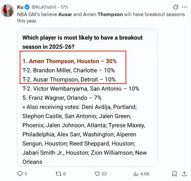 北京时间10月10日,30支NBA球队总经理对新赛季进行投票。 25-26赛季最有可能爆发的球员是谁?火箭队的阿门·汤普森排名第一,活塞队的奥萨尔·汤普森排名第三。阿门将是2023年的第四顺位,而奥萨尔将是2023年的第五顺位。阿门已经进入了ESPN全明星百强评选的前40名,但奥萨尔在活塞队的战术地位并没有那么高,所以奥萨尔还没有进入。而且,奥萨尔在2024年遭遇了血栓,他和哥哥之间还存在着一段距离。在活塞25-26赛季的第二场季前赛中,奥萨尔首发21分钟,罚球7中3、罚球10中5、投篮命中率42.9%,得到11分5篮板1助攻1抢断1盖帽和零失误。资料非常齐全。首节,奥萨尔持球开局,命中对手欧洲步。美国媒体发表了这些图像并写道e:“奥萨尔运动能力很强,随时可以磨合。”同时,奥萨尔还拥有一流的组织能力和知识,这让他可以不惜一切代价复制队友。需要解决的问题是提高三分球和罚球的稳定性。如果你能解决好你的投篮问题,你就能最大限度地发挥你的优势。活塞队主教练比克斯塔夫这样评价奥萨尔:奥萨尔持球时很有节奏,很有威胁,这可以改变对手的防守方式。由于坎宁安包夹的人很多,所以他给了奥萨尔更多的球权,缓解了坎宁安的压力。如果奥萨尔能够利用这种持球在手的情况,康宁汉姆的进攻会更容易。火箭队记者阿里·瓦格纳撰文:阿门已经跻身前40名之列,但别小看奥萨尔。他两次被评为 OTE 总决赛 MVP,一个赛季被评为 OTE 常规赛 MVP。他也是一名顶级的防守球员。他有相同的基因和运动能力能力如阿门。他现在完全健康了。 Mar 当我们进入 Zun 中期时,听到阿门/奥萨尔都进入讨论的前 30 名,请不要感到惊讶。